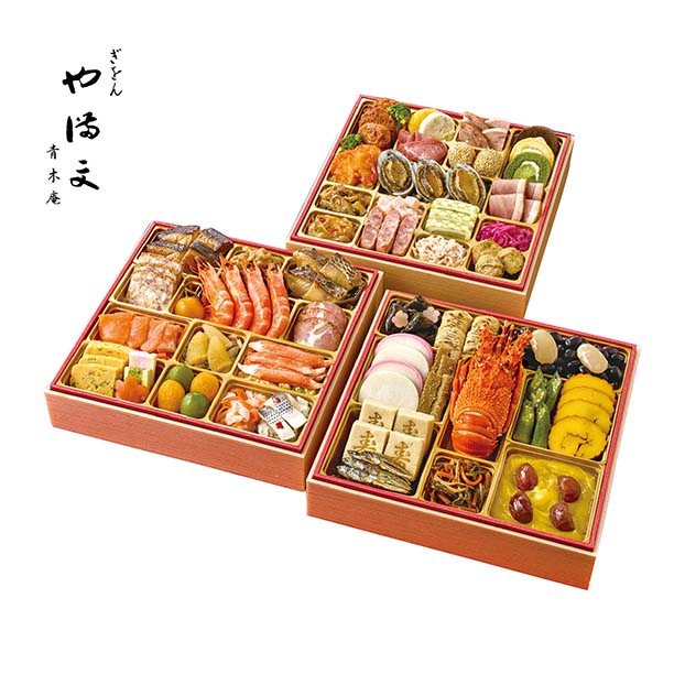 京都「ぎをん や満文」が監修したおせち三段重。お重の段毎で楽しめる和洋中のおせちです。