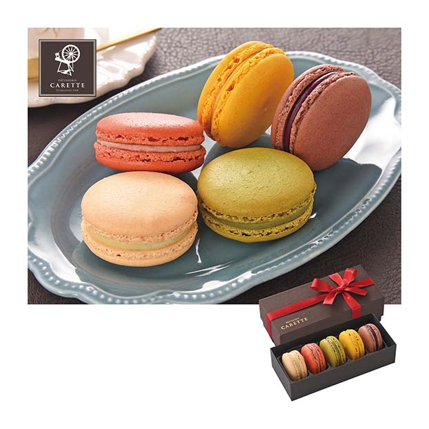 ピスタチオ・苺・バニラ・カシス・パッションフルーツの5つの味を風味豊かなマカロンに閉じ込めました。