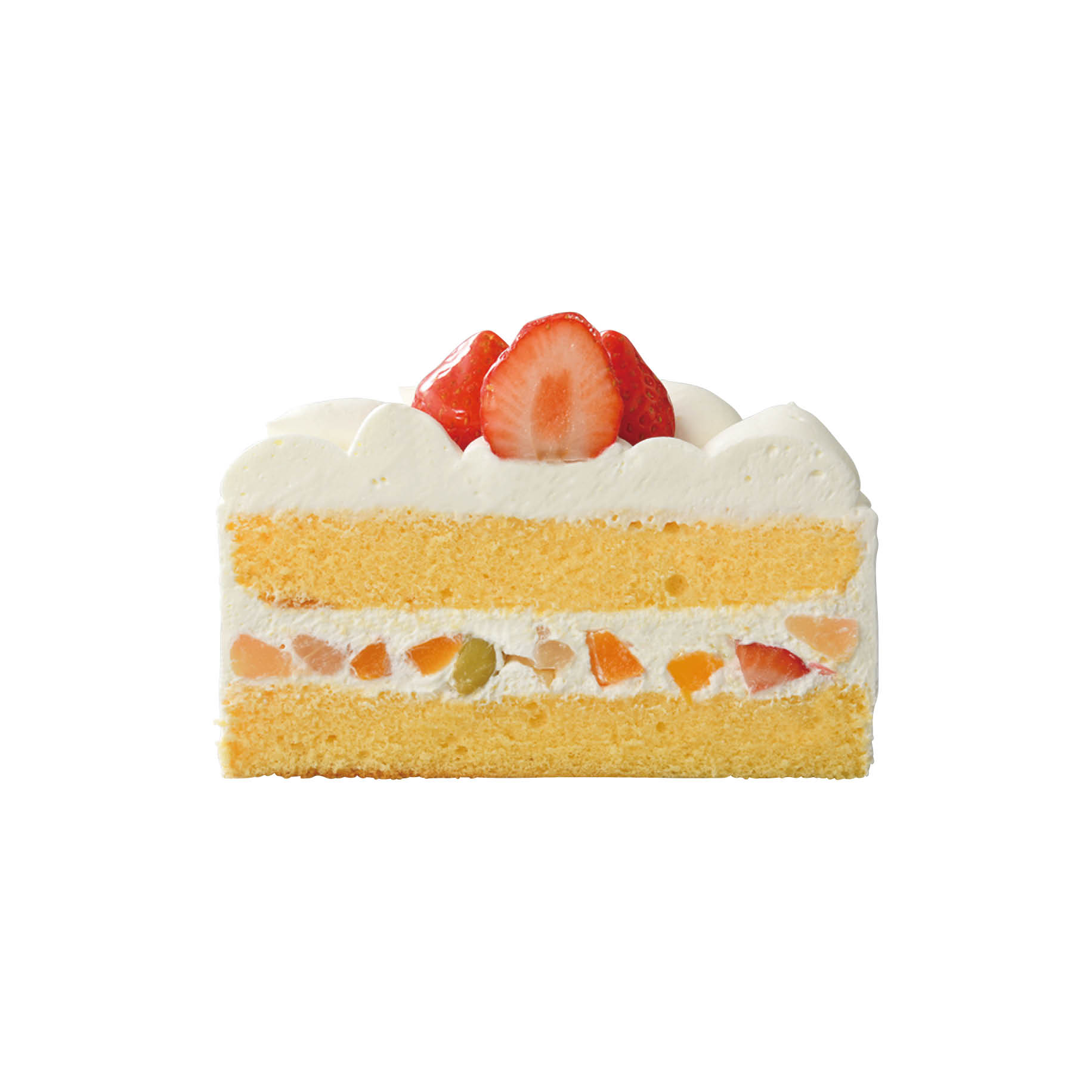 しっとりふわふわスポンジ生地、スッキリ生クリームとフレッシュ苺&ミックスフルーツをサンドしました。