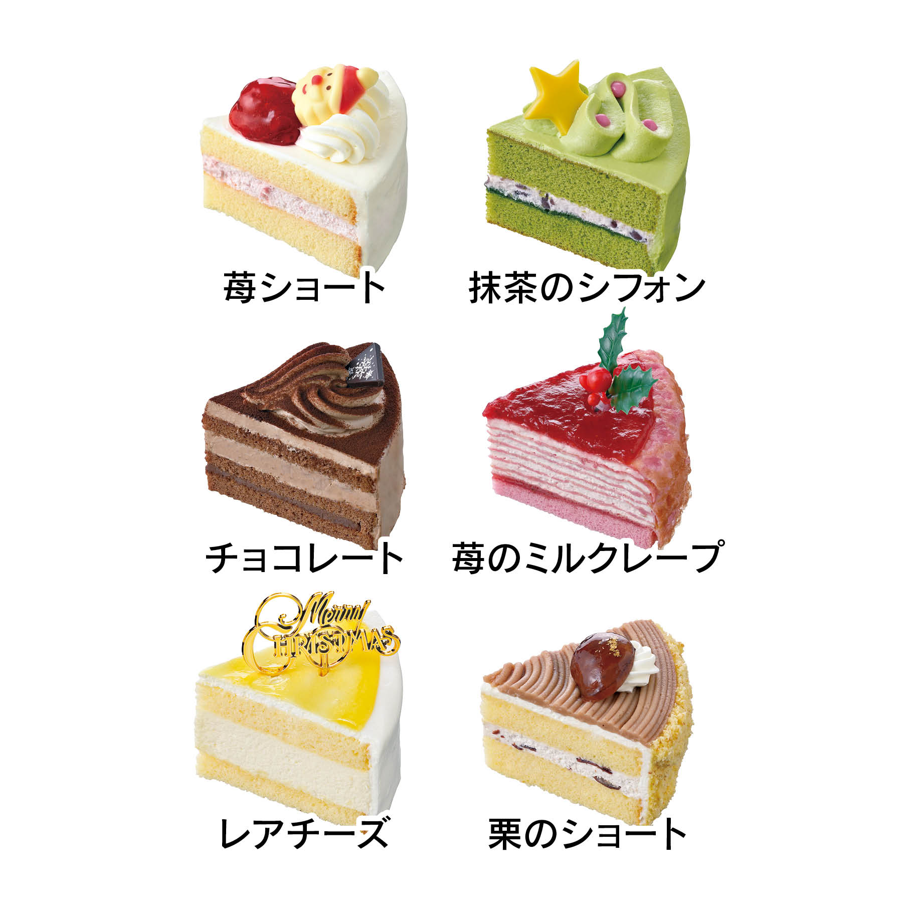 苺ショート、チョコレート、レアチーズ、抹茶のシフォン、苺のミルクレープ、栗のショートの6つのカットケーキのアソートセットです。
