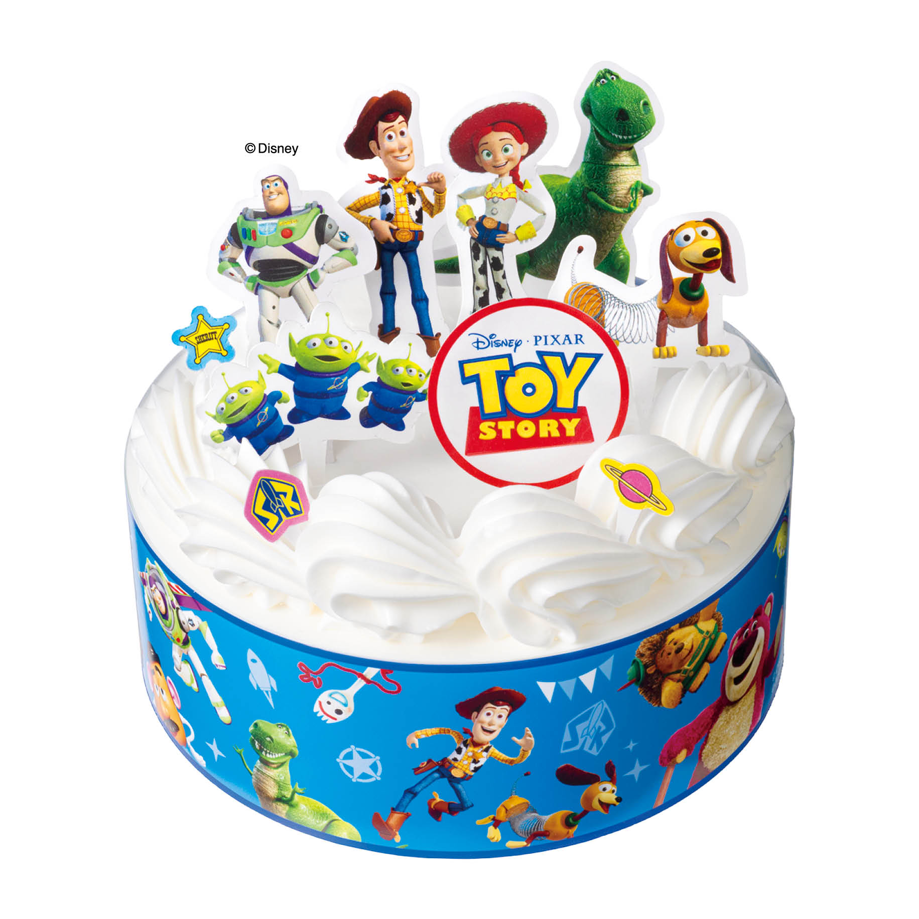 「トイ・ストーリー」のキャラクターピックを自由に飾って楽しめるケーキです。キャラクターがデザインされた保冷バックが1個付属します。