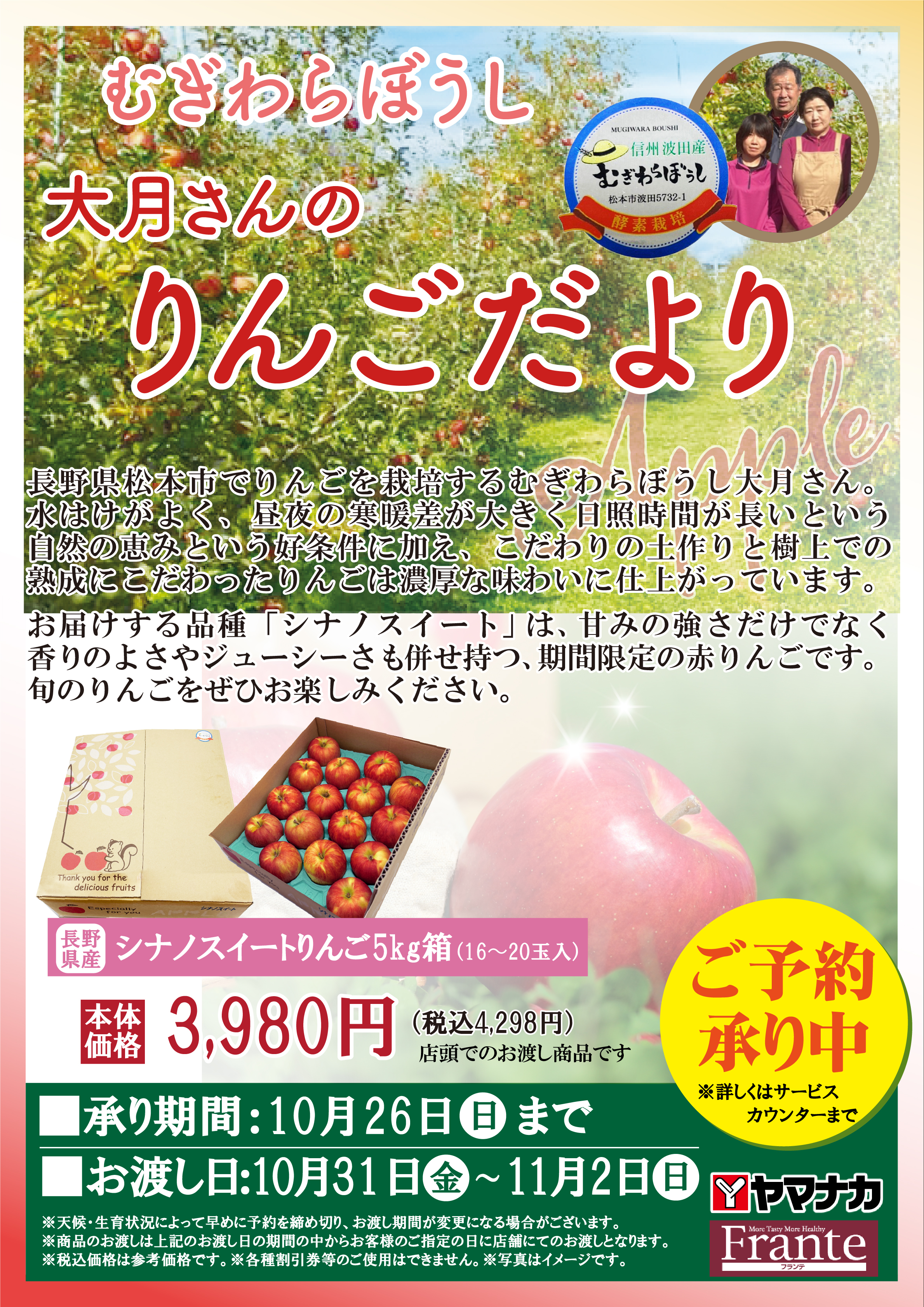 長野県産 「むぎわらぼうし 大月さんのりんごだより」(シナノスイートりんご5kg箱)