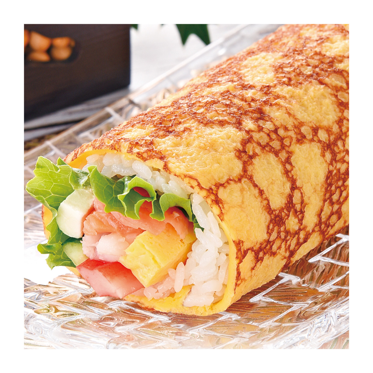 サーモンとこだわりのチーズを海苔を使わず錦糸玉子焼きで巻き上げた洋風な巻寿司に仕立てました。