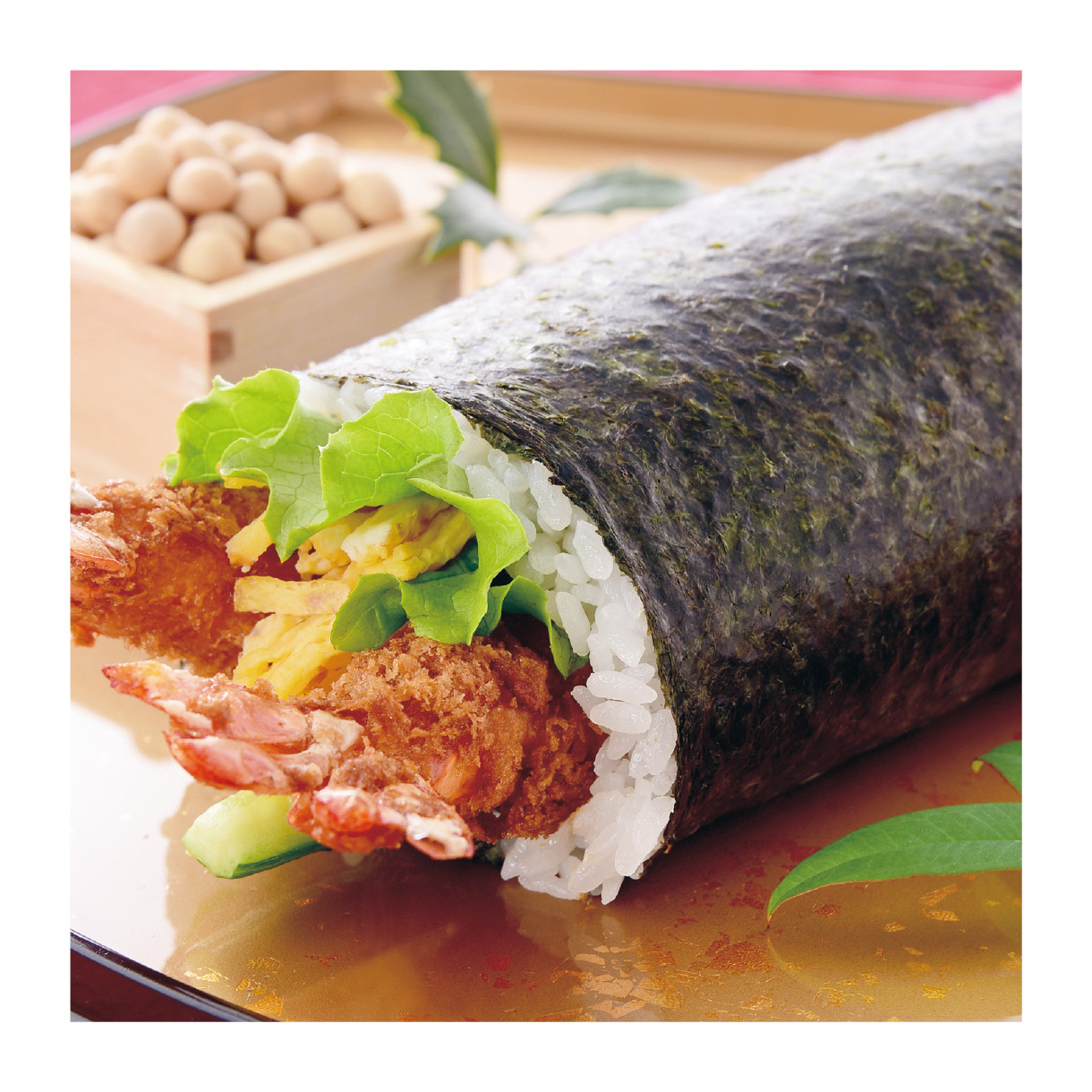 海苔からはみ出さんばかりの海老フライのしっぽを鯱に見立てたお子様も大満足の巻寿司です。