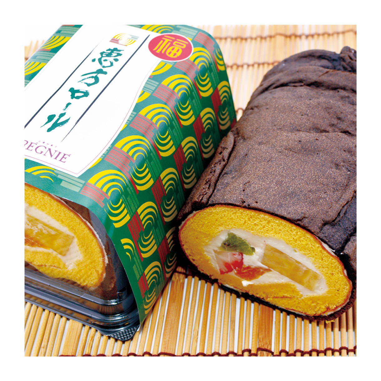 きな粉風味のロールスポンジに苺やキウイなどのフルーツを巻き込み黒いシュー生地で包みました。