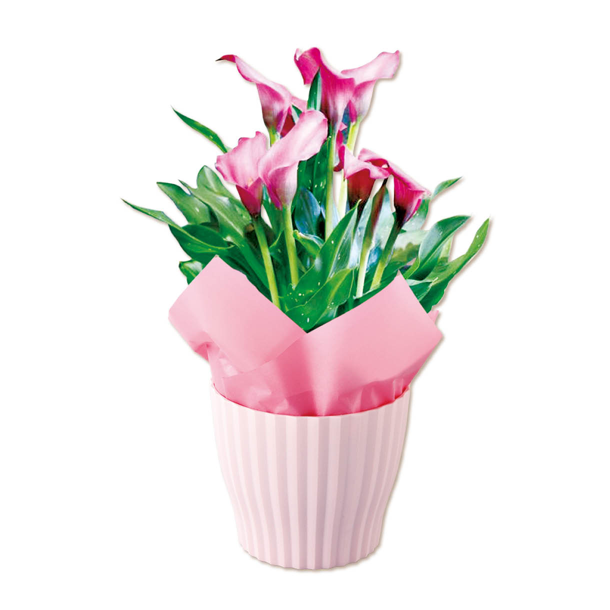 色鮮やかなピンクのカラー。スレンダーな花、葉姿が魅力的な商品です。