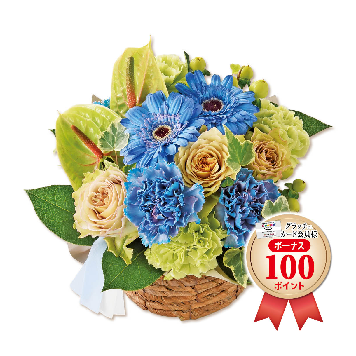 青いカーネーション「ムーンダスト」を使ったアレンジメント。ムーンダストの花言葉は「永遠の幸福」。