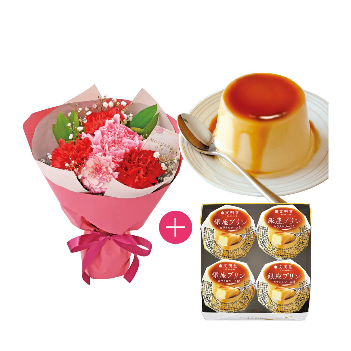 24.カーネーションブーケと「文明堂」銀座プリン4個入セット